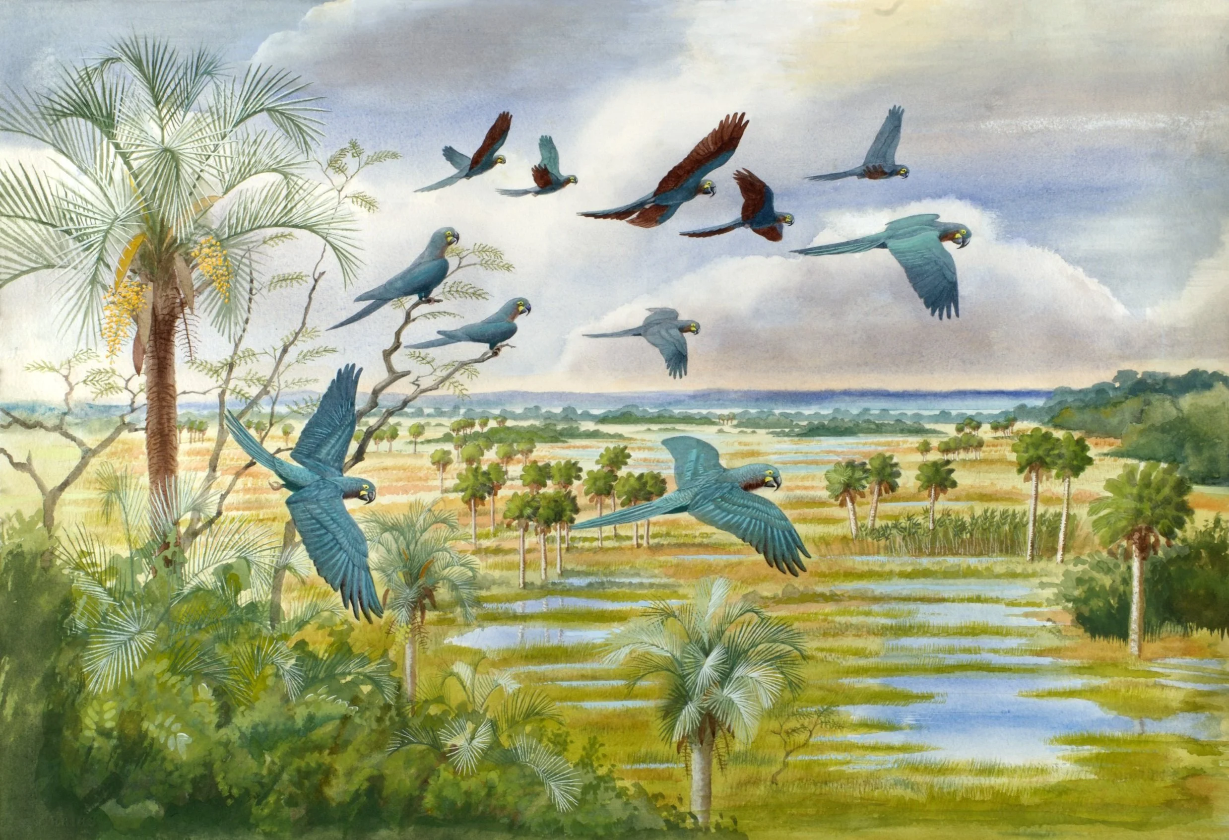 Painting of the extinct Glaucous macaw (Anodorhynchus glaucus) in its habitat