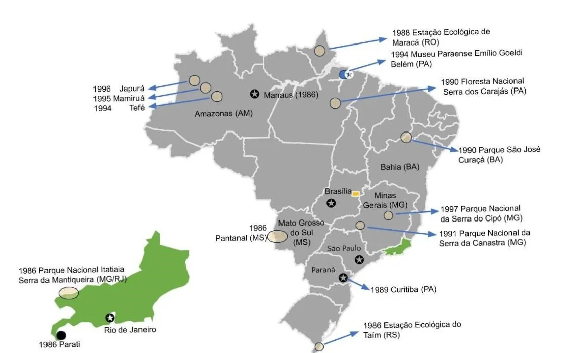 During the 80s and 90s, Jenevora travelled throughout Brazil, spending time in ecological reserves and national parks. She joined a Royal Geographical Society expedition to the rainforests of Maracá island in Roraima. There she sketched the Blue-and-yellow macaw and made her own bird guidebook. In the Serra dos Carajás, she drew the Green-winged macaws gnawing open Brazil nuts with their beak. After observing the last of its species in the district of Curaçá, Jenevora was able to paint the Spix macaw before it was declared extinct in the wild in 2019.